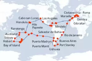 Itinerario : Civitavecchia - Roma, Genova, Marsella, Barcelona, Gibraltar, Casablanca, Mindelo, Salvador de Bahia, Rio de Janeiro, Buenos Aires, Puerto Madryn, Puerto Argentino, Ushuaia, Puerto Montt, Valparaíso, Isla de Pascua, Pitcairn, Papeete, Moorea, Aitutaki, Rarotonga, Bay of Island, Auckland, Tauranga, Christchurch, Dunedin, Milford sound, Hobart, Sidney, Nouméa, Luganville, Apia, Pago Pago, Honolulu, Hilo, Los Angeles, Cabo san Lucas, Puntarenas, Canal de Panama, Canal panama (Enter), Ocho Rios, Road Town, Philipsburg, Las Palmas, Palma de Mallorca, Nápoles, Civitavecchia - Roma