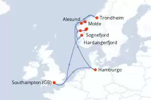 Itinerario : Southampton, Hamburgo, Alesund, Molde, Trondheim, Sognefjord, Lustrafjorden, Skjolden, Hardangerfjord, Southampton