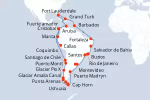 Itinerario : Fort Lauderdale, Grand Turk, Barbados, Fortaleza, Salvador de Bahia, Buzios, Rio de Janeiro, Santos, Montevideo, Buenos Aires, Puerto Madryn, Ushuaia, Cap Horn, Punta Arenas, Glaciar Amalia Canal, Glaciar Pio X, Puerto Montt, Santiago de Chile, Coquimbo, Cristobal, Callao, Manta, Fuerte amador, Canal de Panama, Aruba, Fort Lauderdale