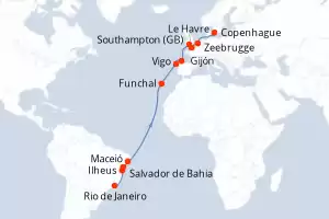 Itinerario : Rio de Janeiro, Ilheus, Salvador de Bahia, Maceió, Funchal, Vigo, Gijón, Southampton, Le Havre, Zeebrugge, Copenhague, Oslo, Hamburgo