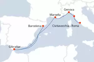 Itinerario : Barcelona, Gibraltar, Marsella, Genova, Pisa/Florencia (Livorno), Civitavecchia - Roma