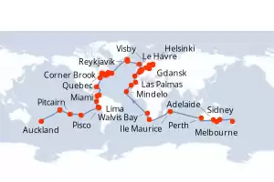 Itinerario : Auckland, Sidney, Melbourne, Adelaide, Perth, Ile Maurice, Ciudad del Cabo, Walvis Bay, Mindelo, Las Palmas, Casablanca, La Coruña, Le Havre, Brujas, Gdansk, Visby, Helsinki, Tallin, Estocolmo, Copenhague, Ijmuiden, Dover, Lerwick, Reykjavik, Grundarfjordur, Isafjordhur, St Johns, Corner Brook, Quebec, Saguenay, Charlottetown, Sidney, Halifax, Nueva York, Miami, Cartagena de Indias, Gatun, Manta, Lima, Pisco, Isla de Pascua, Pitcairn, Papeete, Moorea, Auckland