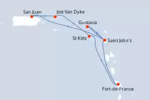 Itinerario : San Juan, Saint John's, Gustavia, Saint John's, Fort-de-France, St Kitts, Jost Van Dyke, San Juan, Saint John's, Gustavia, Saint John's, Fort-de-France, St Kitts, Jost Van Dyke, San Juan