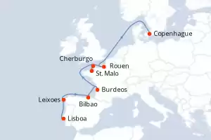 Itinerario : Lisboa, Leixoes, Bilbao, Burdeos, Cherburgo, St. Malo, Rouen, Copenhague, Lisboa, Leixoes, Bilbao, Burdeos, Cherburgo, St. Malo, Rouen, Copenhague
