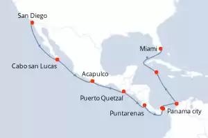 Itinerario : San Diego, Cabo san Lucas, Acapulco, Puerto Quetzal, Puntarenas, Panama city, Canal de Panama, Cartagena de Indias, Georgetown Islas Caiman, Miami