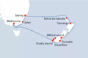 Itinerario : Sidney, Eden, Melbourne, Doubtfoul, Dusky sound, Milford sound, Dunedin, Timaru, Tauranga, Bahía de Islandia, Sidney, Hobart, Sidney
