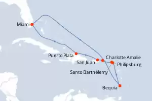 Itinerario : Miami, Puerto Plata, San Juan, Charlotte Amalie, Philipsburg, Santo Barthélemy, Bequia, Miami