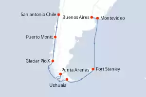 Itinerario : Buenos Aires, Montevideo, Puerto Argentino, Ushuaia, Punta Arenas, Glaciar Pio X, Puerto Montt, San antonio Chile
