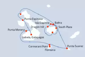 Itinerario : Baltra, Gardner Bay, Punta Suarez, Cormorant Point, Floreana, Punta Moreno, Isabela, Galapagos, Punta Espinoza, Punta Vicente Roca, South Plaza, Isla Daphne, Dragon hill, Puerto Isidro Ayora, Baltra