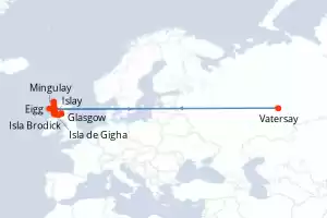 Itinerario : Glasgow, Isla Brodick, Islay, Isla de Gigha, Tobermory, Vatersay, Mingulay, Stornoway, Îles Shiant, LOCH SCAVAIG , Eigg, Iona, Staffa , Colonsay, Glasgow